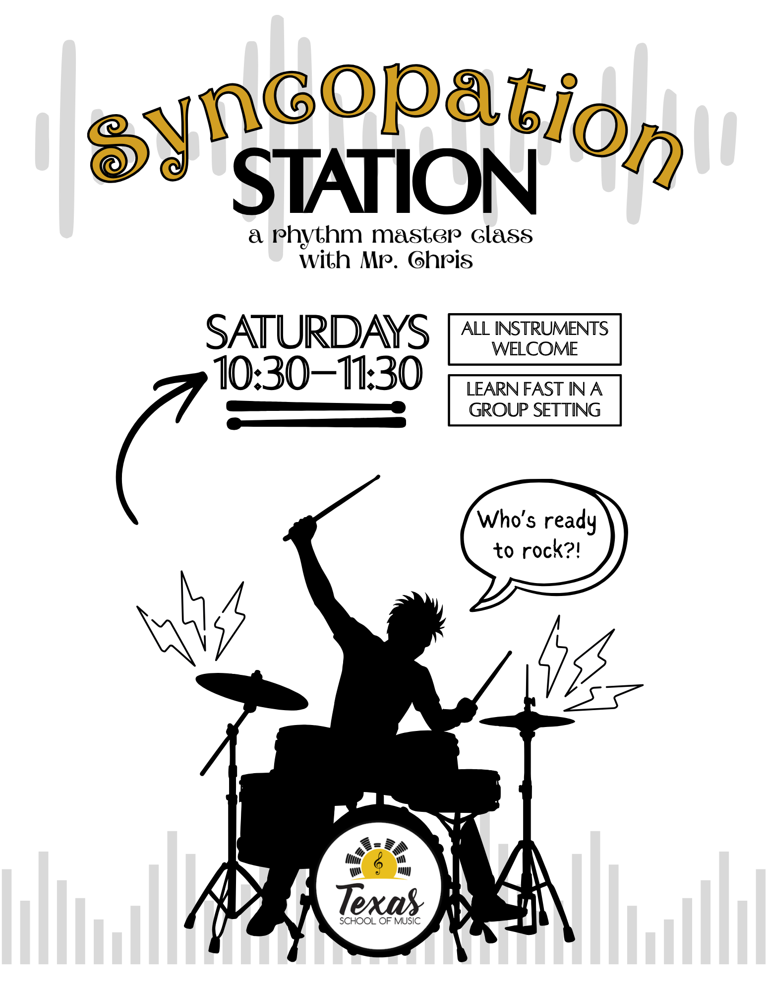 We will begin a new workshop beginning in May! Mr. Chris will be instructing “Syncopation Station”, a rhythm master class. All instruments are welcome! Learn fast in a group setting with your peers. FREE for any student enrolled in a subscription! It will be held on Saturdays from 10:30-11:30. Reach out to sign up!